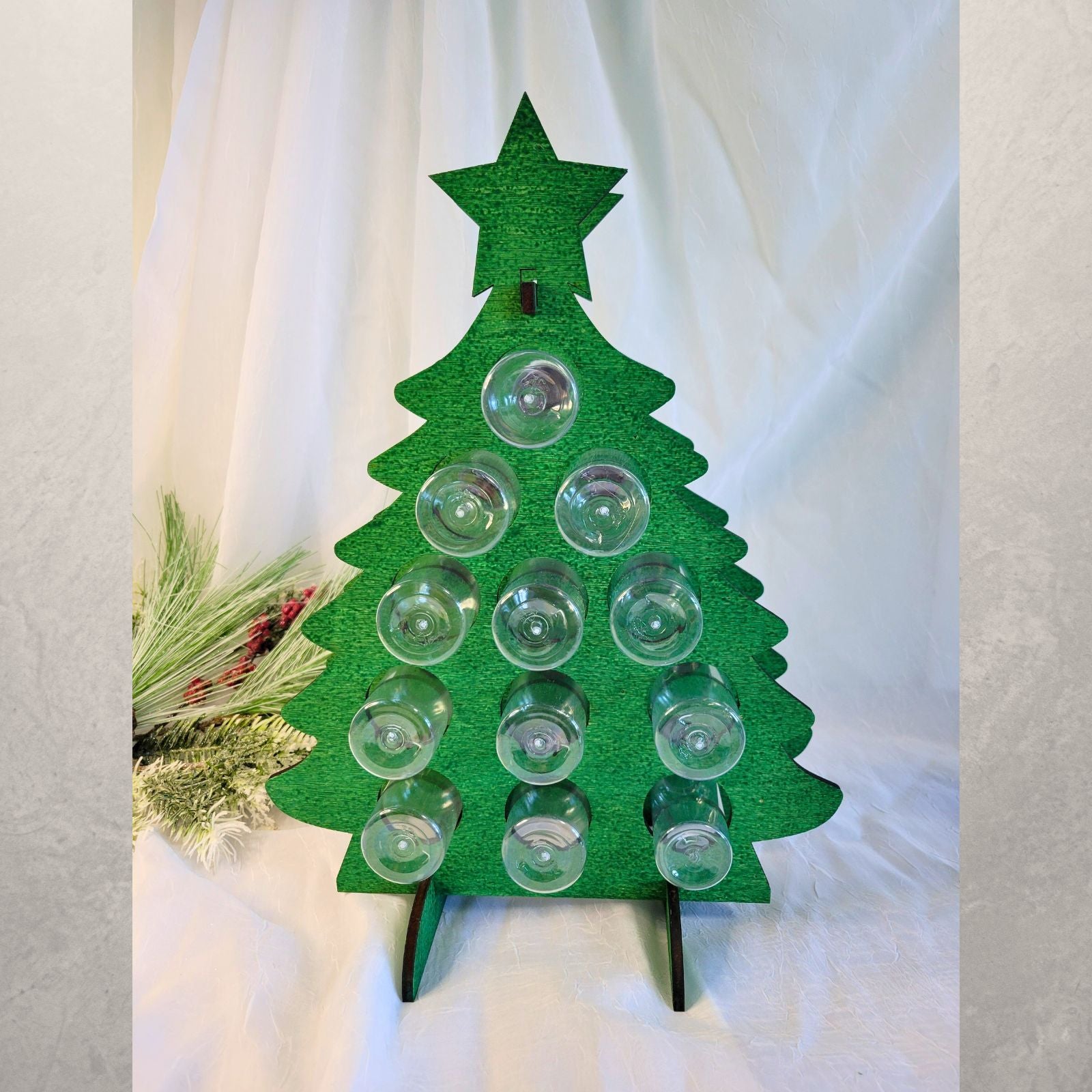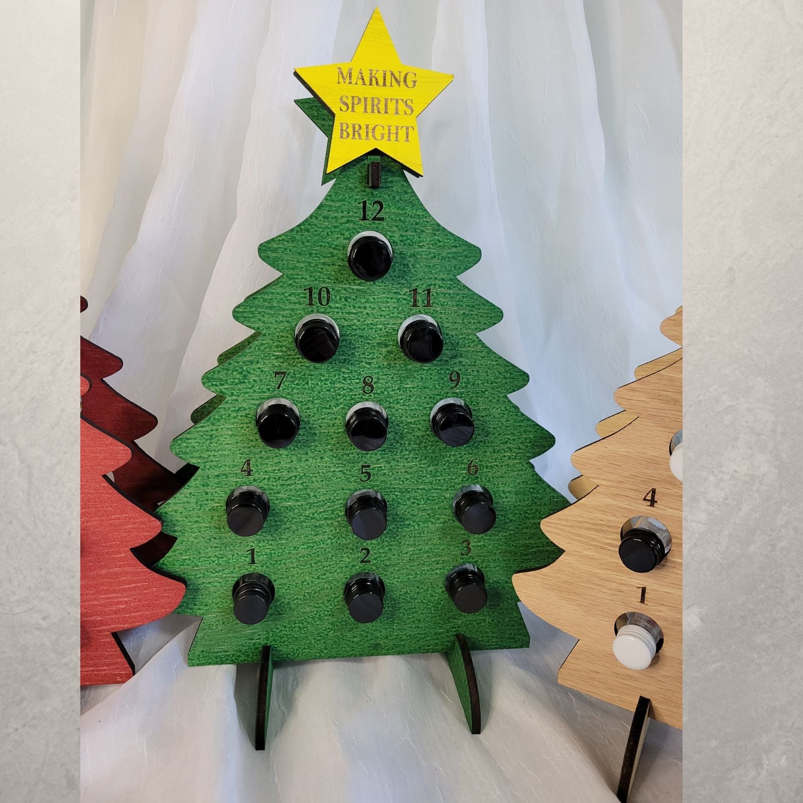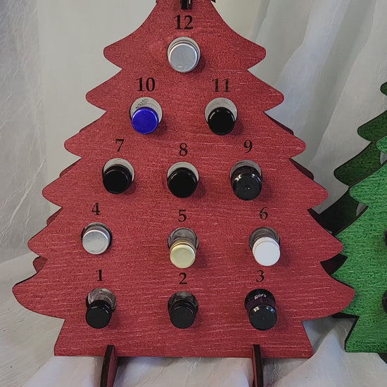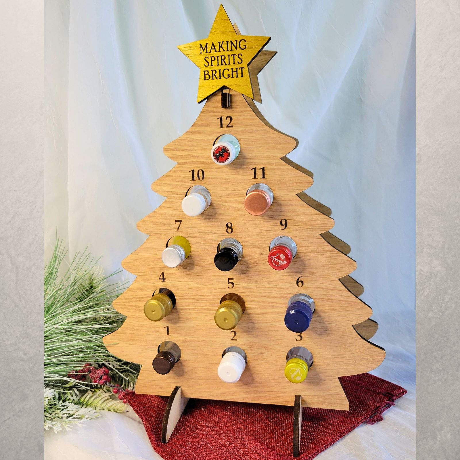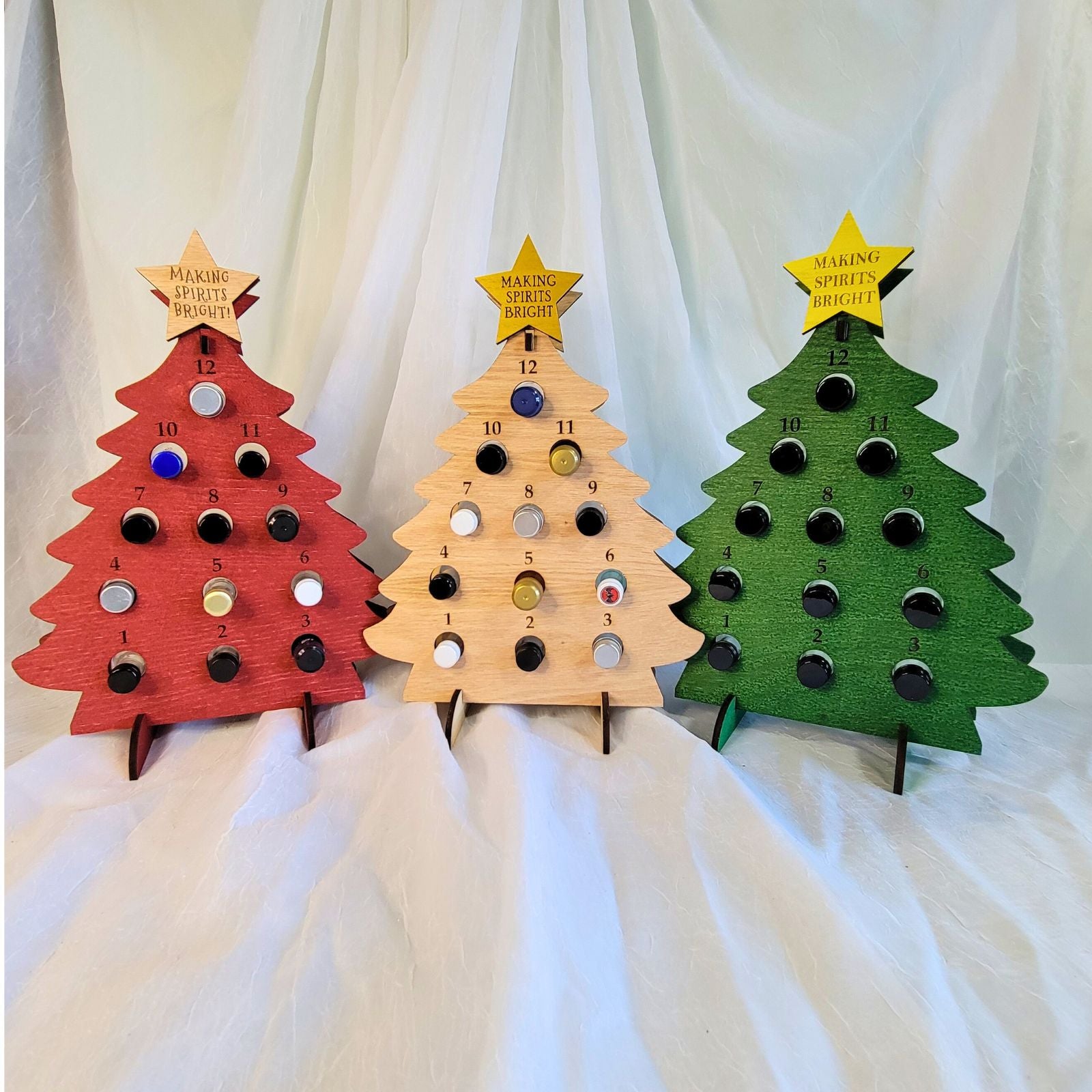 Count down the holidays with this personalized adult advent calendar for mini liquor bottles. Choose from our various colors for the tree, star, and even personalize the text for the star on the tree! It holds 12 mini liquor bottles sized up to 1.6" circumference. They can also be personalized to have one tree numbered 1-12 and the second 13-24!