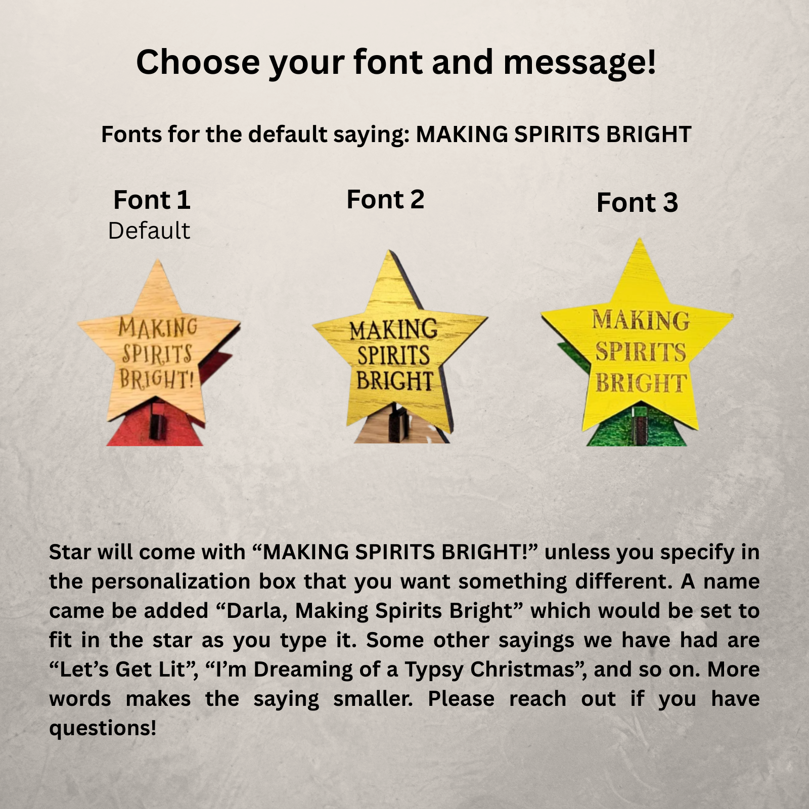 Text Options: "Making Spirits Bright" or Personalized Text (must be filled out in the "special instruction box" when in your cart. Personalized Text Examples: "The Tillmans, Making Spirits Bright) ('Tis the Season) There is room for 3-5 lines of text. Be sure to type personalization exactly as you want it engraved (including capitalizations).